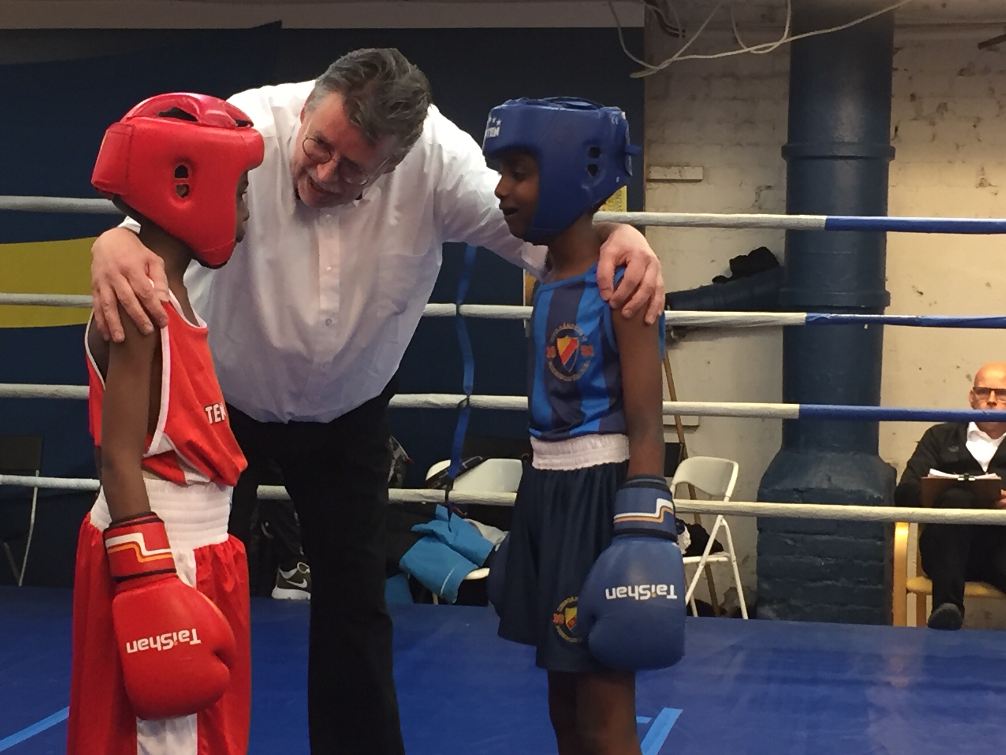 De allra yngsta boxarna Lucas Nzinga, Rågsveds BK och Ezra Tesfaghi, Djurgårdens IF får lite anvisningar av ringdomaren Janne Bengtsson.